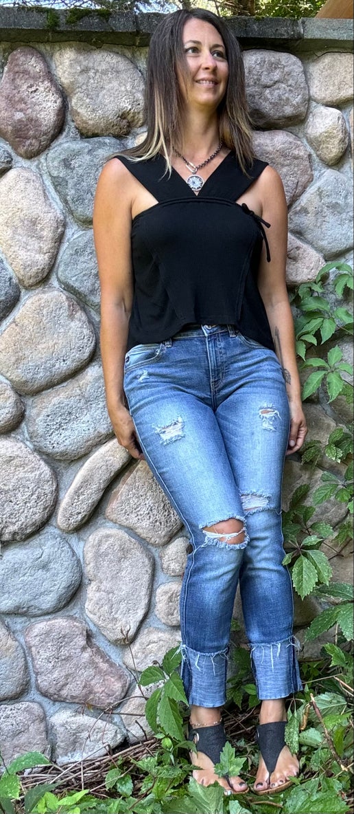 tie loop detailing, ribbed knit top.